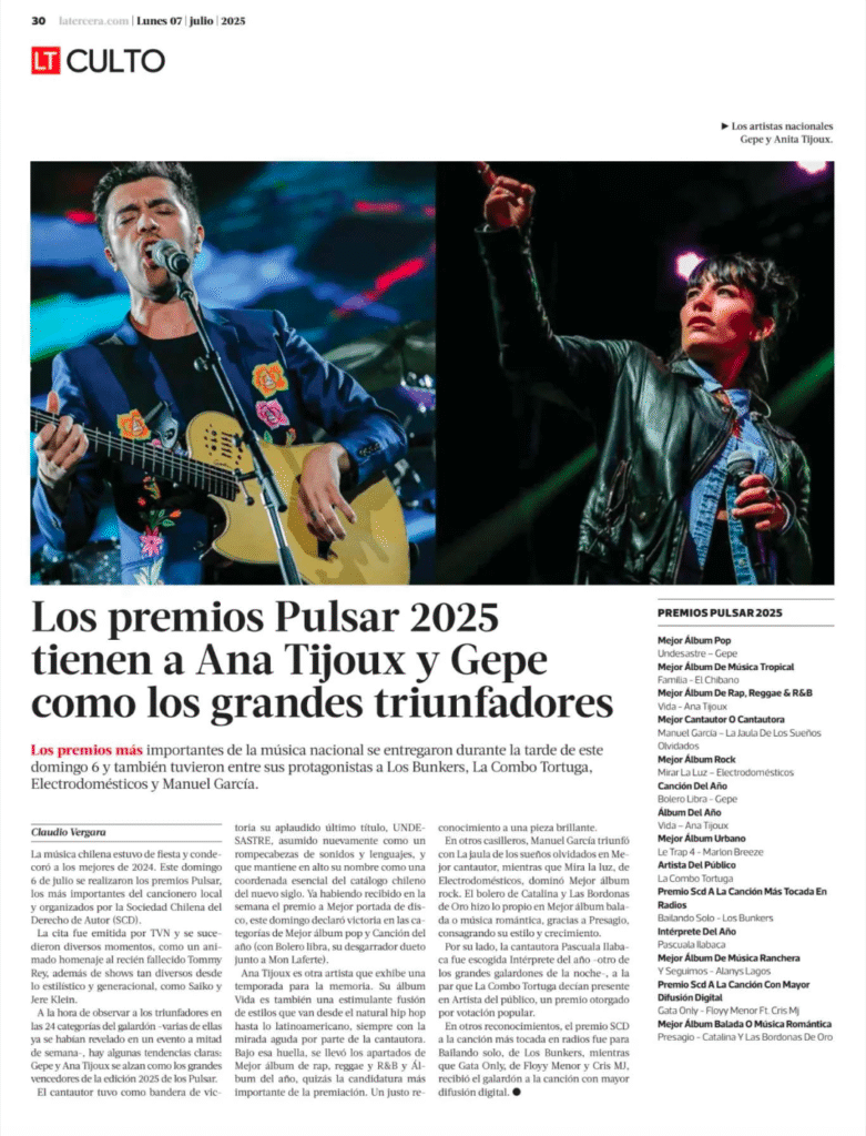 La Tercera: «Los premios Pulsar 2025 tienen a Ana Tijoux y Gepe como los grandes triunfadores»